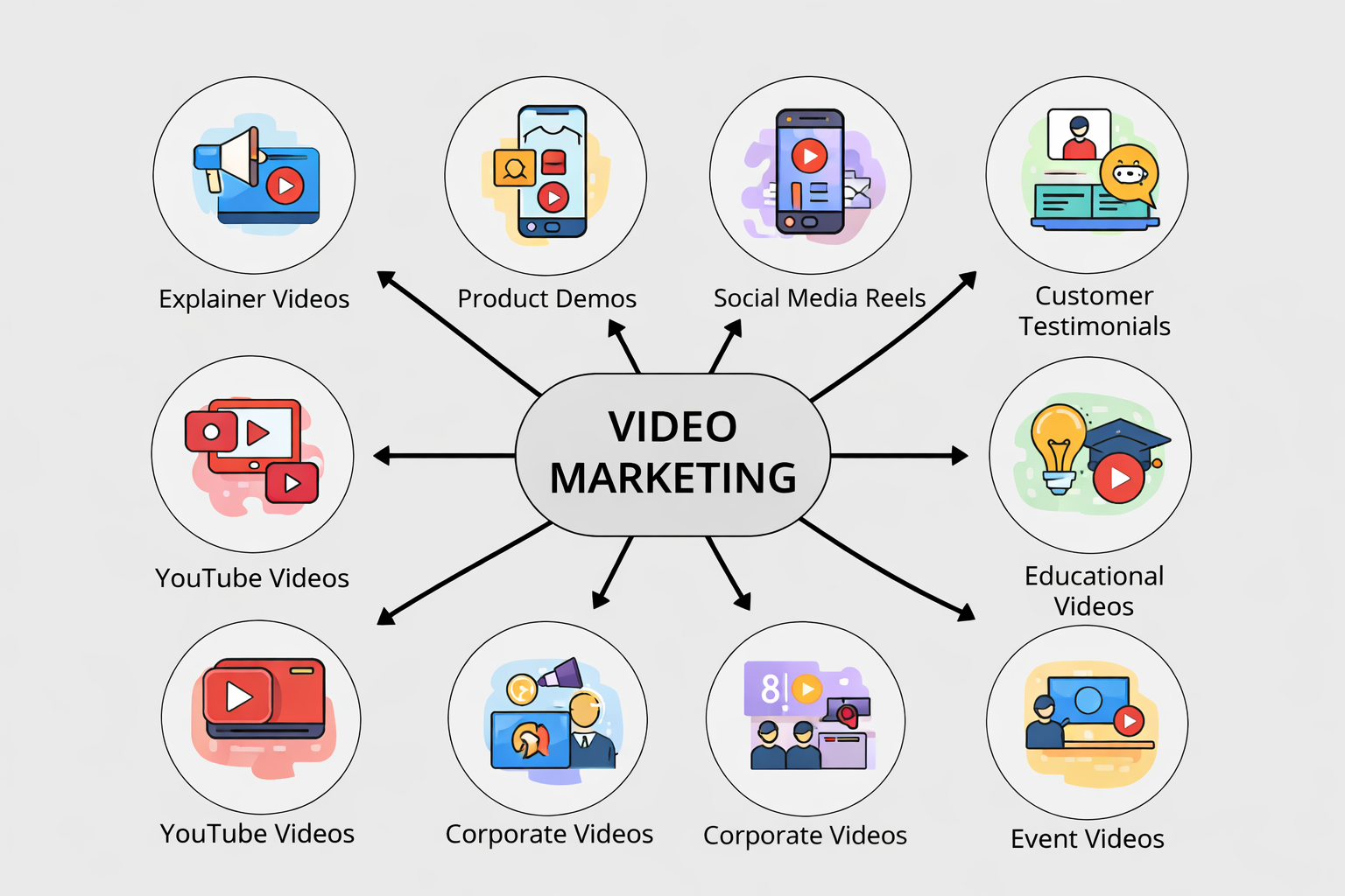 Video marketing focuses on creating and distributing video content that promotes a brand, product, or service. Businesses use videos to educate audiences, showcase products, build trust, and improve engagement across digital platforms.